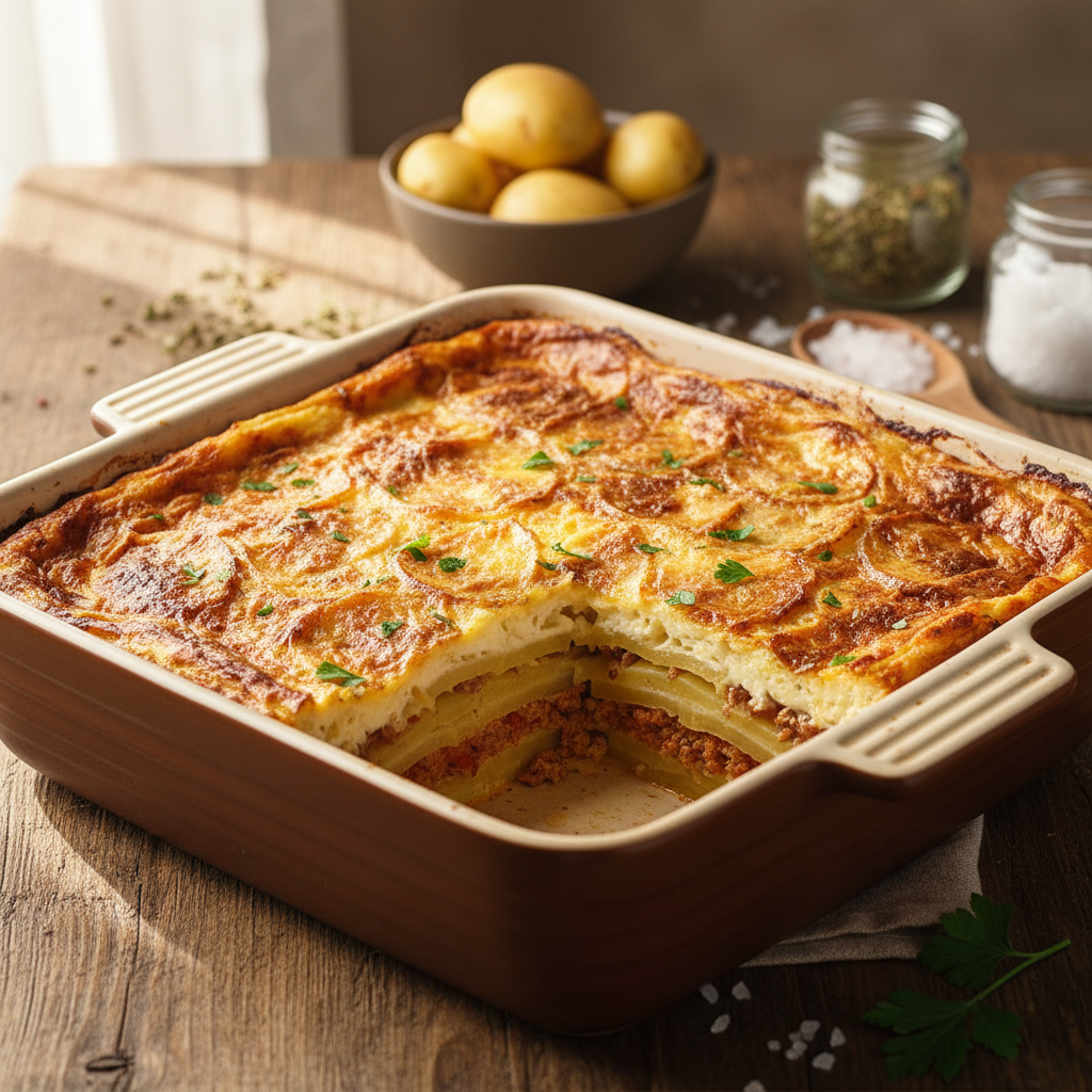 - Slaganje slojeva: Pećnicu zagrijte na 200°C. Posudu za pečenje premažite masnoćom. Ocijedite krumpir (pustio je vodu od stajanja). Na dno posude složite red krumpira, lagano preklapajući ploške. Preko krumpira rasporedite polovicu mesnog umaka. Zatim stavite novi red krumpira, pa ostatak mesa. Završite s redom krumpira na vrhu. Ovaj gornji sloj krumpira lijepo posložite jer će on biti vidljiv.