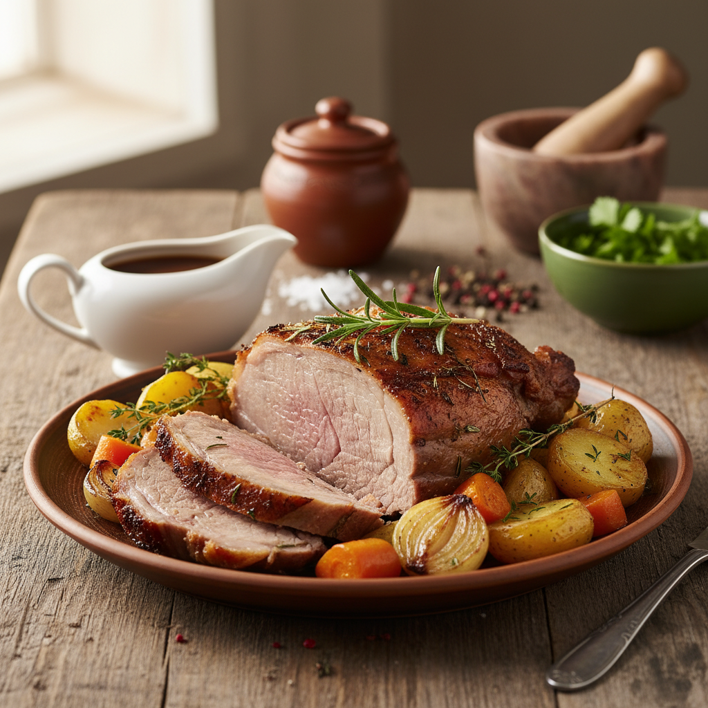 Vrijeme pečenja ovisi o veličini komada. Računajte otprilike 1 sat pečenja po kilogramu mesa na 180°C. Pola sata prije kraja, maknite foliju. Tada dodajte povrće (ako ga niste ranije pripremili) i pustite da se meso zapeče i dobije hrskavu koricu. Tijekom ovog perioda, svakih 10 minuta žlicom prelijte meso sokovima iz protvana.